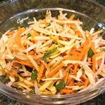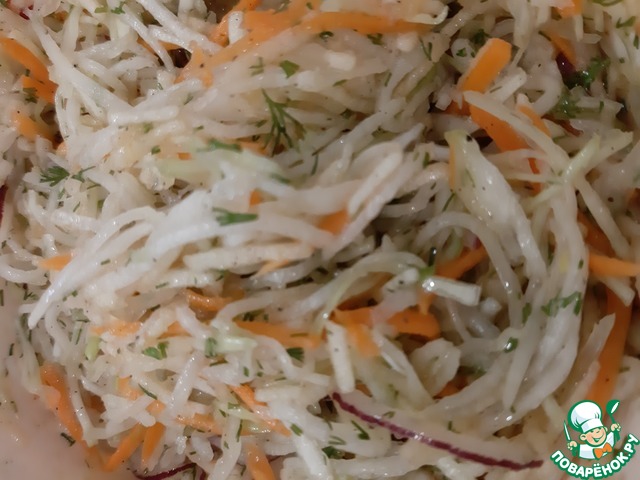 Дайкон, морковь и яблоко натереть на корейской терке. Яблоко от кожуры очищать не надо. Мелко нашинковать укроп и капусту.