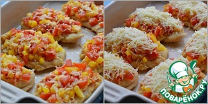 На противень или в большую форму для выпечки выложить куриное филе. На каждый кусок филе равномерно разложить овощи с сыром.