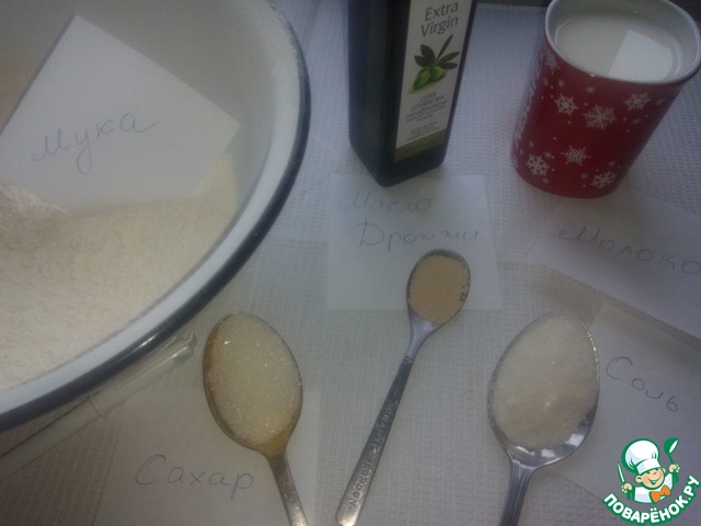 • В теплое молоко добавить сахар, дрожжи и половину муки, размешать, накрыть пленкой и на полчаса отправить в теплое место.