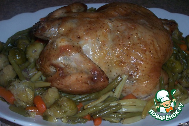 Готовую курицу кладём на блюдо и вокруг раскладываем овощи, на гарнир картошка, рис.