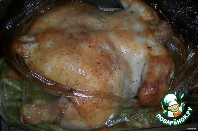 За 15 минут до готовности вытянуть, развязать мешок и дать зарумянится. Если хотите переверните, чтоб зарумянился и низ курицы.