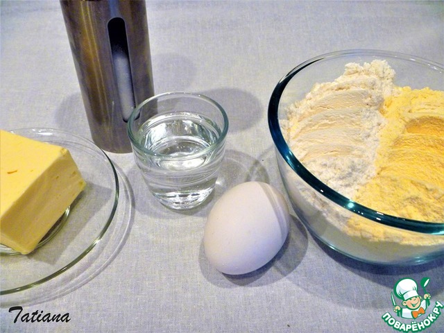 Смешайте два вида муки + соль, перетрите со сливочным маслом, добавьте яйцо, вымешивайте тесто, добавляя по столовой ложке холодной воды. Тесто должно получиться гладкое и плотное, не липнувшее к стенкам миски. Поместите тесто в пакет, уберите в холодильник. -