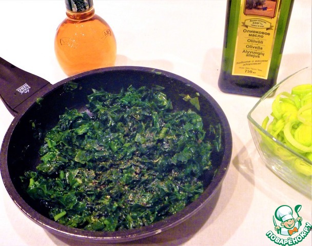 Шпинат хорошо промойте, произвольно нарежьте. В сковороду влейте две ст. ложки оливкового масла, нагрейте, поместите шпинат в сковороду накройте крышкой (нагрев выключите) на 2-3 минуты, посолите, поперчите.