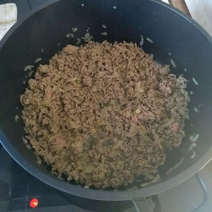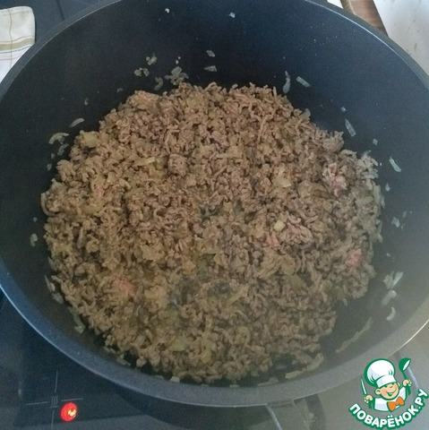 В сотейник отправляем измельчённый лук с фаршем. Можно обжарить сначала лук, после добавить фарш. Обжарить до рассыпчатости.