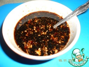 Приготовить маринад: смешать бальзамический уксус, сахар, соевый соус, перец, натертый на мелкой терке имбирь, чеснок через чеснокодавилку.