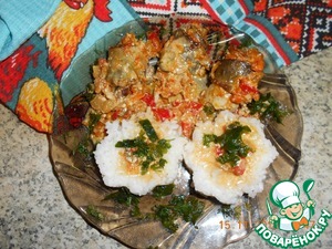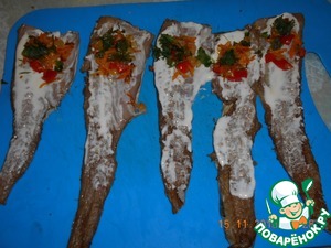 Вытащить рыбу из маринада ( 1 ст. л маринада нам понадобится для приготовления заливки). На филе намазываем сливочный сыр, кладем по ч. л обжаренных овощей, чуть зелени петрушки.