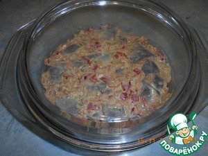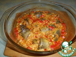 Готовим заливку: в оставшиеся жареные овощи добавляем 5-6 ст. л сметаны и 1 ст. л маринада, который остался после маринования рыбы, перемешиваем. Дно формы смазать маслом, выложить немного овощей, на них рулетики.