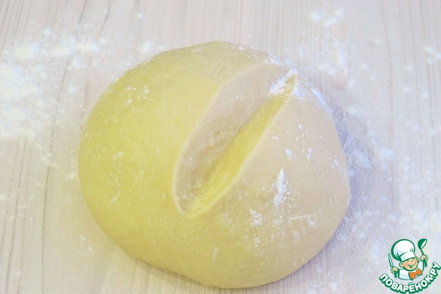 Затем кусок теста выложить на поверхность стола и в течение 30-35 мин. вымешивать тесто, постепенно подсыпая муку. Затем тесто обернуть пищевой пленкой и оставить на два часа.