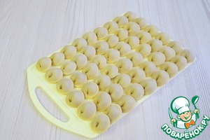 Доску подпылить мукой, выложить готовые пельмени.