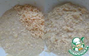 Капусту перемешать с добавленными ингредиентами до однородности. Сыр нашинковать и добавить к капустной массе, еще раз перемешать. По консистенции масса будет похожа на тесто для оладьев.