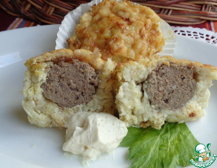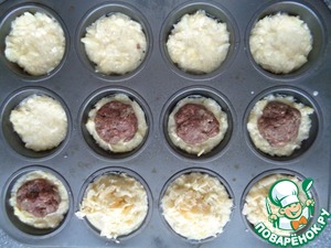 Разогреть духовку до 200 градусов. Смазать форму для кексов растительным маслом, обязательно на дно положите бумагу для выпечки (бумажные формы для выпечки кексов) тогда не будет проблем с извлечением после запекания (я не положила, а зря). Заполнить капустной массой половину формы. Из фарша сформировать колобок, положить в форму и закрыть капустной массой. Нашинковать еще сыра и разложить сверху.