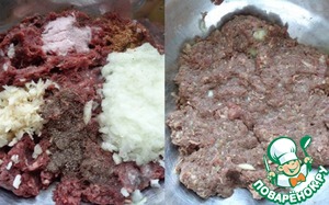 Приготовить начинку: в любой мясной фарш (у меня оленина) добавить черный молотый перец, соль, измельченные лук и чеснок, приправу для фарша. Перемешать.