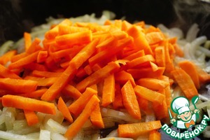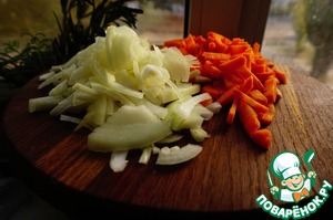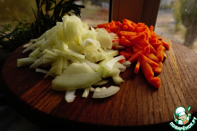 Чистим лук и морковь. Нарезаем лук четвертькольцами, а морковь соломкой.