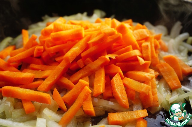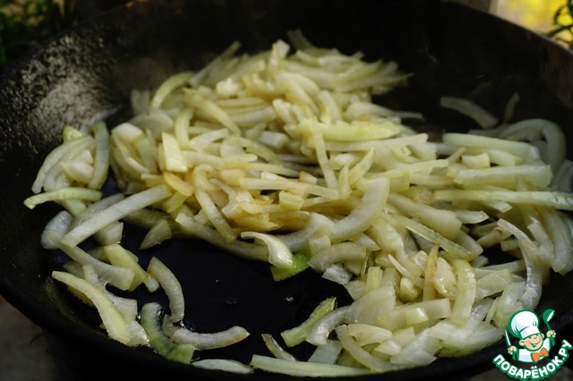 На разогретую сковороду наливаем растительное масло и бросаем туда лук. Его надо сразу подсалить, чтобы лук не подгорел. Жарим лук до прозрачности.