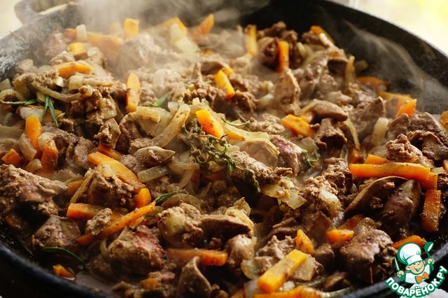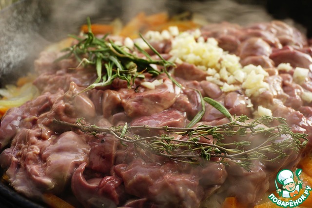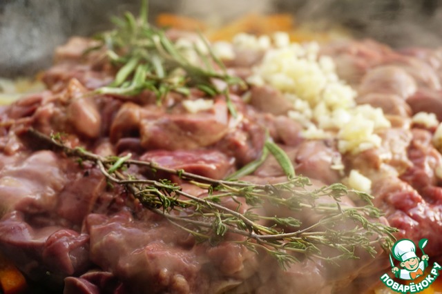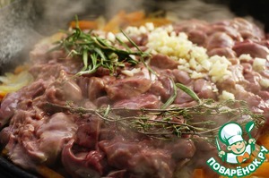 К овощам отправляем печень, тимьян, розмарин и чеснок.