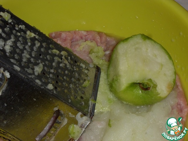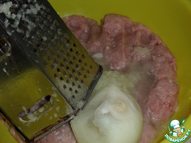 В глубокую чашку выкладываем фарш из кролика. В чашку с фаршем натираем на терке репчатый лук.