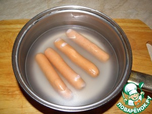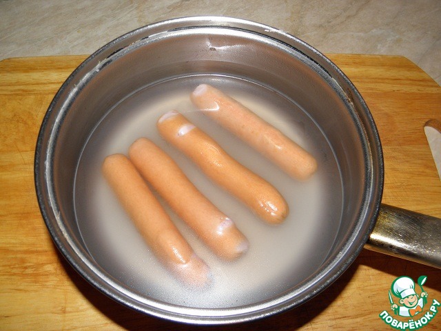 Сосиски положить в кастрюлю с холодной водой, поставить на сильный огонь и дать закипеть. Буквально чуть прокипятить и сразу достать, не переваривать!