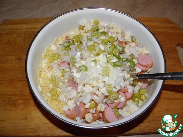 Добавить яйца, сельдерей и сосиски
