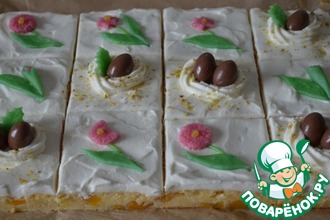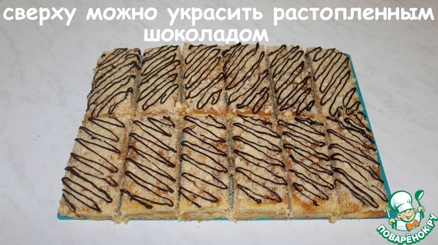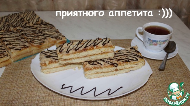 После того как коржи пропитаются, разрезаем на равные кусочки.