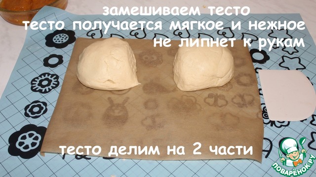 Замешиваем тесто. Тесто получается мягкое, нежное и не липнет к рукам. Тесто делим на 2 равные части.