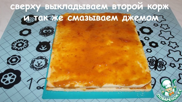 Сверху выкладываем второй корж и так же смазываем джемом.