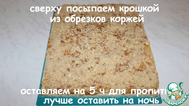 Сверху посыпаем крошкой из обрезков коржей. Оставляем на 5 часов для пропитки, а лучше оставить на ночь.