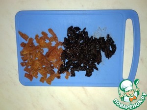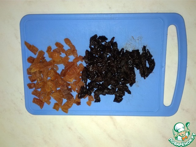 - Сухофрукты (Курага и чернослив, чаще делаю с двумя свежими яблоками,в оригинале рецепта изюм,так что начинка любая на ваш вкус) — 100 г
