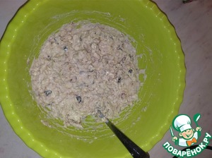 По истечении 10 минут добавляем в тесто чайную ложку разрыхлителя и начинку, всё перемешиваем