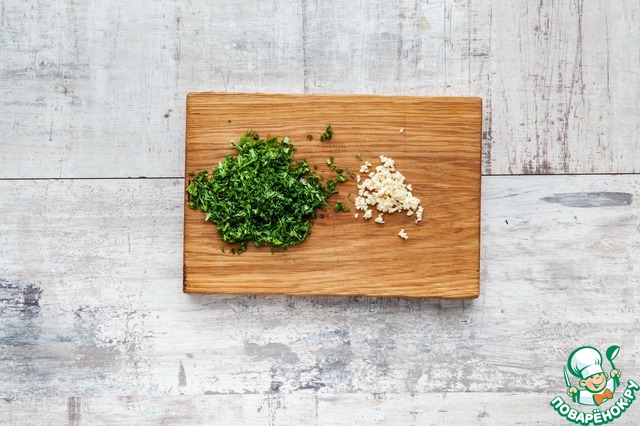 Очень мелко нарежьте зелень, посолите, дайте постоять 5–7 мин. Мелко порубите чеснок и добавьте к зелени.