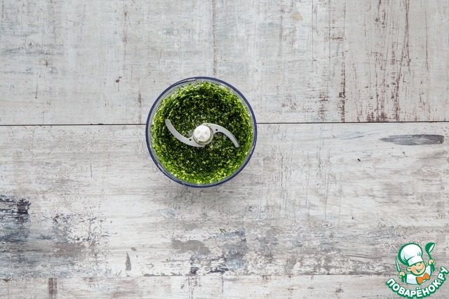 Измельчите зелень с чесноком погружным блендером в пасту (сначала будет плохо получаться, но проявите немного терпения, и все получится).