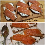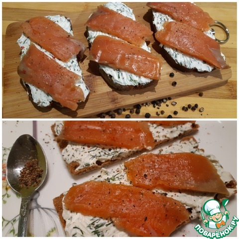 - Лосось (ломтики, слабосоленого или холодного копчения) — 300 г