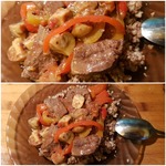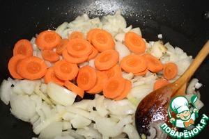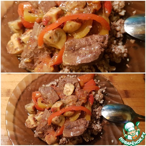 Нужно обжарить печень, обжарить морковь с луком , грибами и перцем.