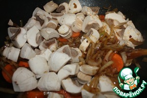 Затем добавляем шампиньоны и жарим дальше 5 минут.