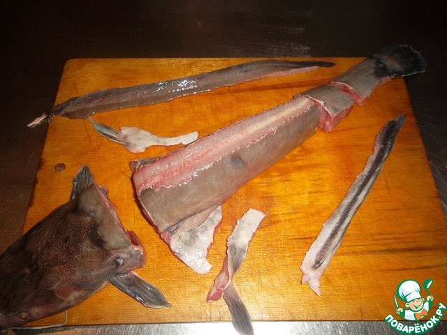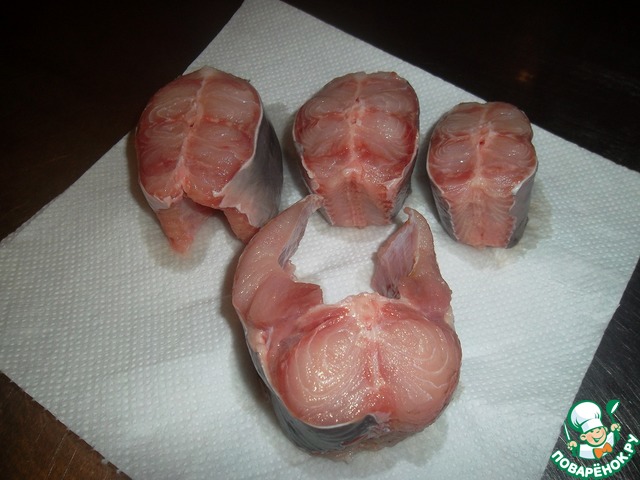 Среднюю часть разрезаем на порционные куски, подсушиваем на салфетках и отправляем в холодильник. Поскольку бульон – дело не быстрое, советую посудину с этими кусками затянуть пищевой пленкой…