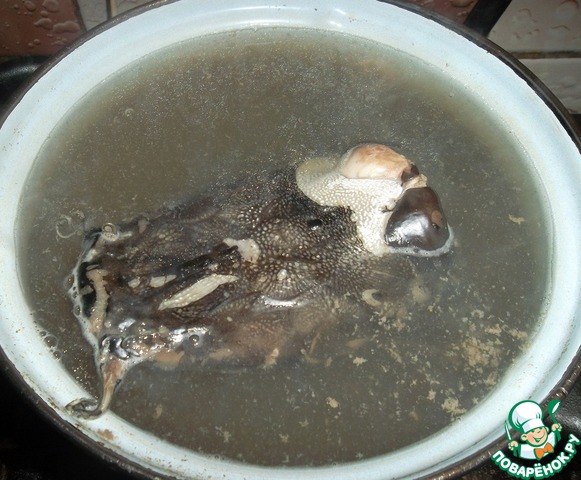 Все остальное, вместе с луком и кореньями загружаем в кастрюлю, заливаем водой и доводим до кипения на сильном огне. Снимаем шум, убавляем огонь до минимума, кидаем перец и лавр и оставляем томиться часа на 2,5…3.