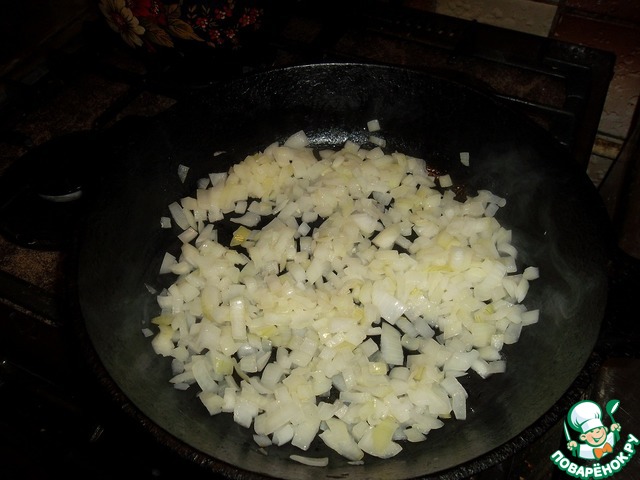 В сковороду вливаем масло и обжариваем лук, резаный кубиком, до «стекла»…