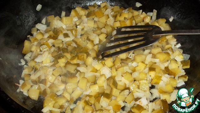 Добавляем огурцы, так же резаные кубиком, и обжариваем минут 5. Если огурцы большие – лучше их почистить и удалить семена. Мы, обычно, закрываем не большие огурчики, поэтому нет смысла заниматься этим делом…