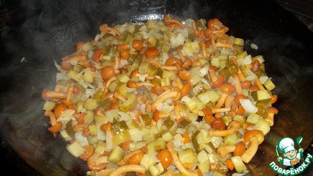 Затем грибы – минут 7…10. Грибы можно брать разные. Если сухие – предварительно замочить и отварить, если обычные шампиньоны – просто порезать не мелко. У меня были такие. Даже не стал резать, так как они довольно таки мелкие…