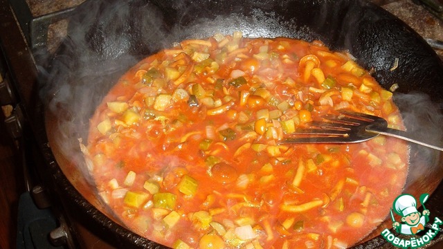 Вливаем томат и тушим, пока не выпарится лишняя жидкость. Пару слов по поводу томата: если использую домашний сок, а не пасту, то для ускорения процесса слегка выпариваю его на отдельной (сухой) сковороде. А если пасту – наоборот, слегка разбавляю бульоном…