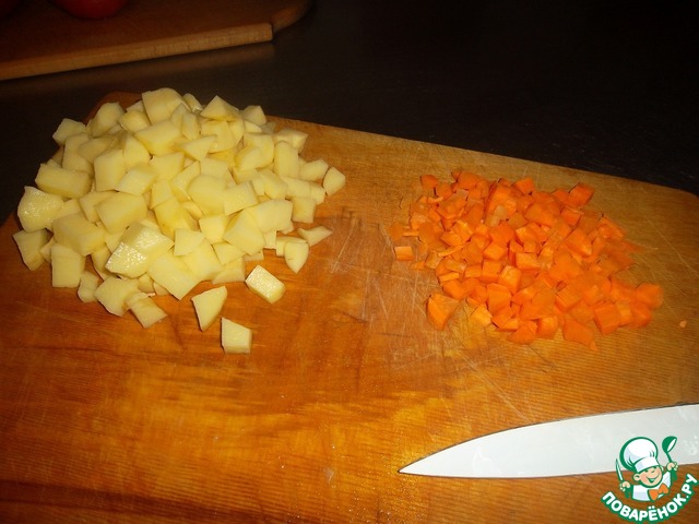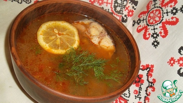 Соединяем в кастрюле картофель, морковь, зажарку, вливаем процеженный бульон, доводим до кипения и варим на медленном огне до мягкости картофеля и моркови. Пробуем и доводим солью до вкуса, если есть необходимость. Добавляем порционные куски рыбы, варим 12…15 минут, выдавливаем чеснок и отставляем с огня…