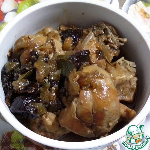 Когда лук подрумянится, добавить горчицу, вымытый чернослив, лавровый лист, немного посолить и поперчить.