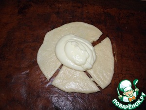 Такие быстрые плюшки, ватрушки, или розочки сделать можно, если хотите, с великолепным сметанным кремом по рецепту Танечки (mtata), ссылку на рецепт дам ниже. Разрезать раскатанный кусочек теста на 3 неравных части, в серединку положить начинку. (извините за не особую аккуратность разрезов, готовили дети)))