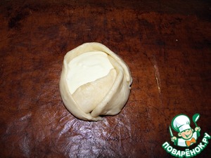 Затем обернуть начинку самой маленькой частью, затем средней, а потом самой большой и закрепить кончики. Можно сделать ватрушки, плюшки ниже и выше.
