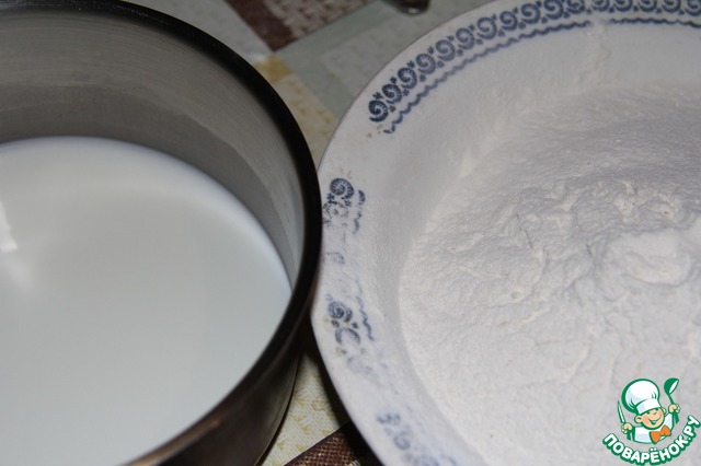 Муку смешать с солью и разрыхлителем. Просеять. Добавить примерно половинув основную массу. Вымесить. Затем влить молоко и снова перемешать. Добавить оставшуюся муку и вымесить окончательно.
