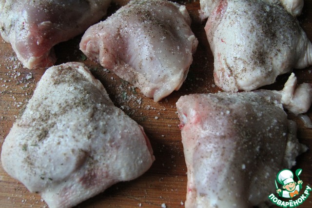 Положить в маринад бедра и оставить в нем не менее чем на 30 минут. Лучше подольше.