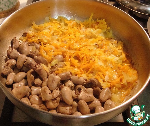 • В сковороду с приготовленными сердечками добавить обжаренные лук с морковью.