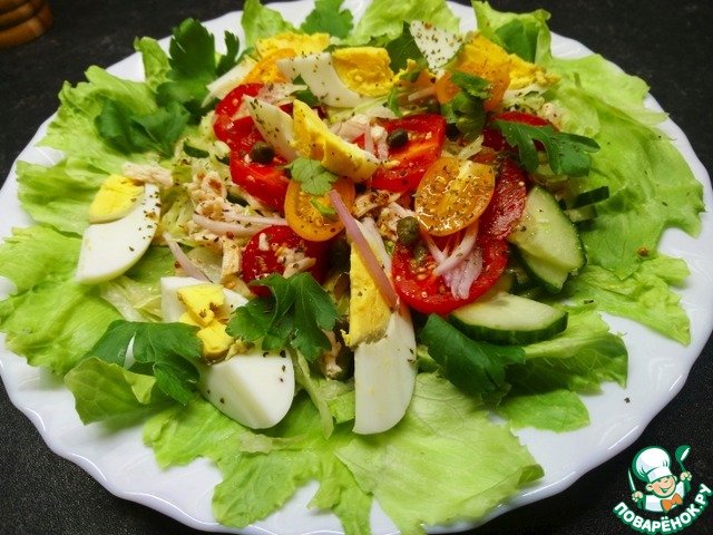 Легкий, незатейливый салатик. Каперсы придают ему особенную изюминку.