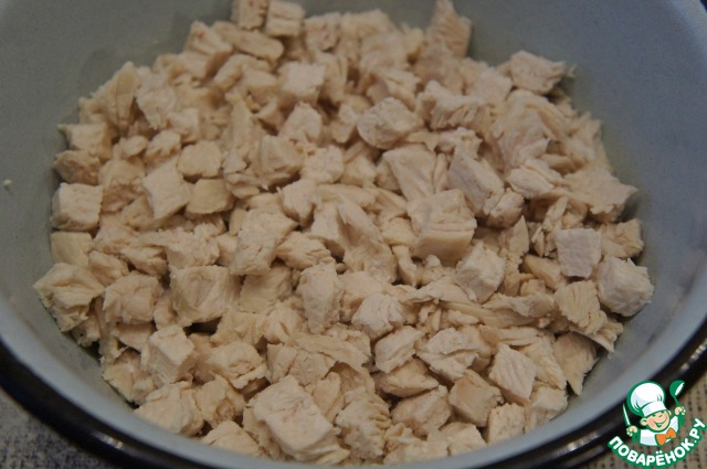 Куриное мясо сварить, нарезать мелкими кубиками.
