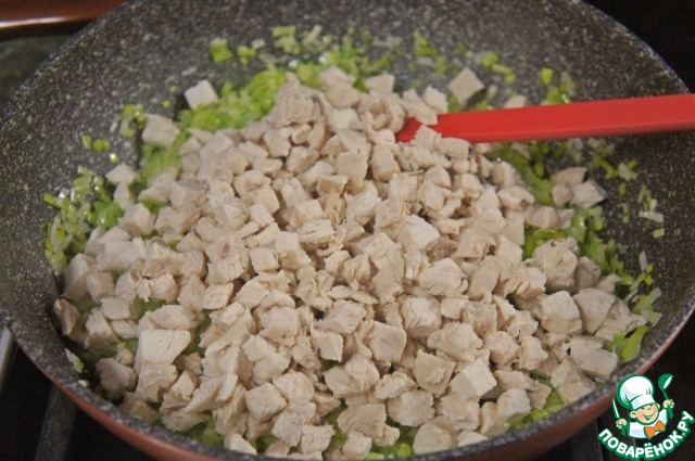 Добавить курицу, перемешать, прогреть вместе в течение 3-4 минут, снять с огня.