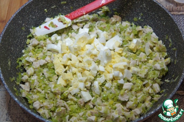 Сварить вкрутую 2 яйца, мелко нарубить или натереть на крупной терке. Добавить к начинке.